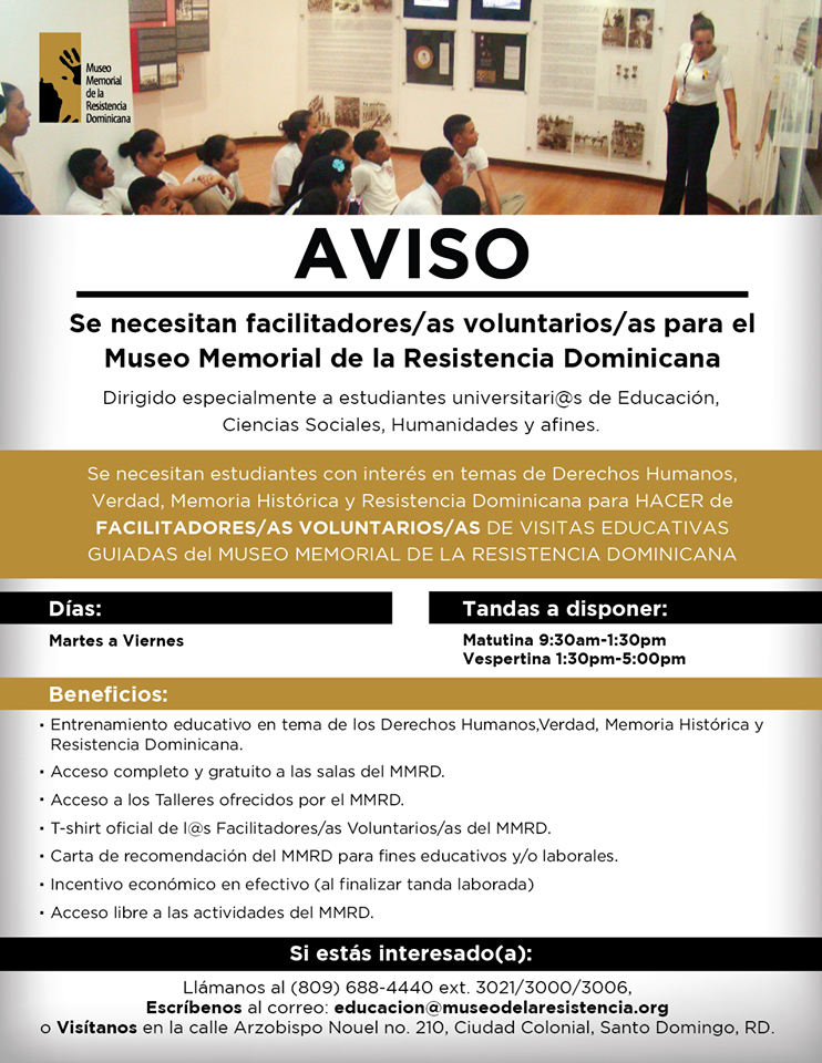 Si estas interesado llamamos al (809) 688-4440 ext. 3021/3000/3006 o escríbenos a: educacion@museodelaresistencia.org