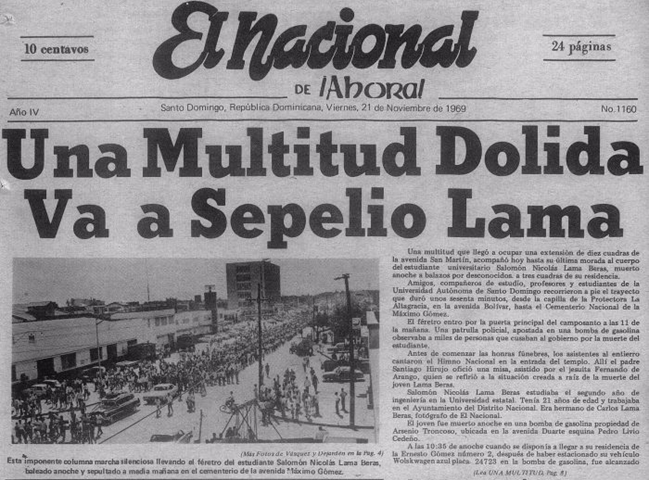 Multitudinario desfile fúnebre en Santo Domingo (1969). Miles de personas manifiestan indignación por el asesinato a tiros del joven Nicolás Salomón Lama Beras, estudiante de segundo año de ingeniería en la Universidad Autónoma de Santo Domingo.
