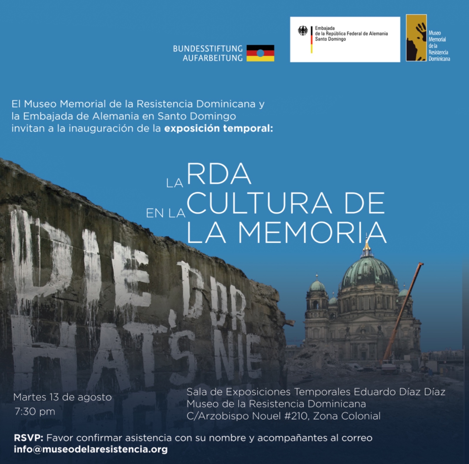 septiembre 26, 2024Santo Domingo, DN, 14/08/2024.-El Museo Memorial de la Resistencia Dominicana y la Embajada de Alemania inauguraron la exposición temporal “La RDA en la cultura de la memoria”, en un acto oficial que estuvo encabezado por la embajadora de la República Federal de Alemania en el país, la señora Maike Friedrichsen y la directora-fundadora del Museo de la Resistencia, la doctora Luisa De Peña Díaz.